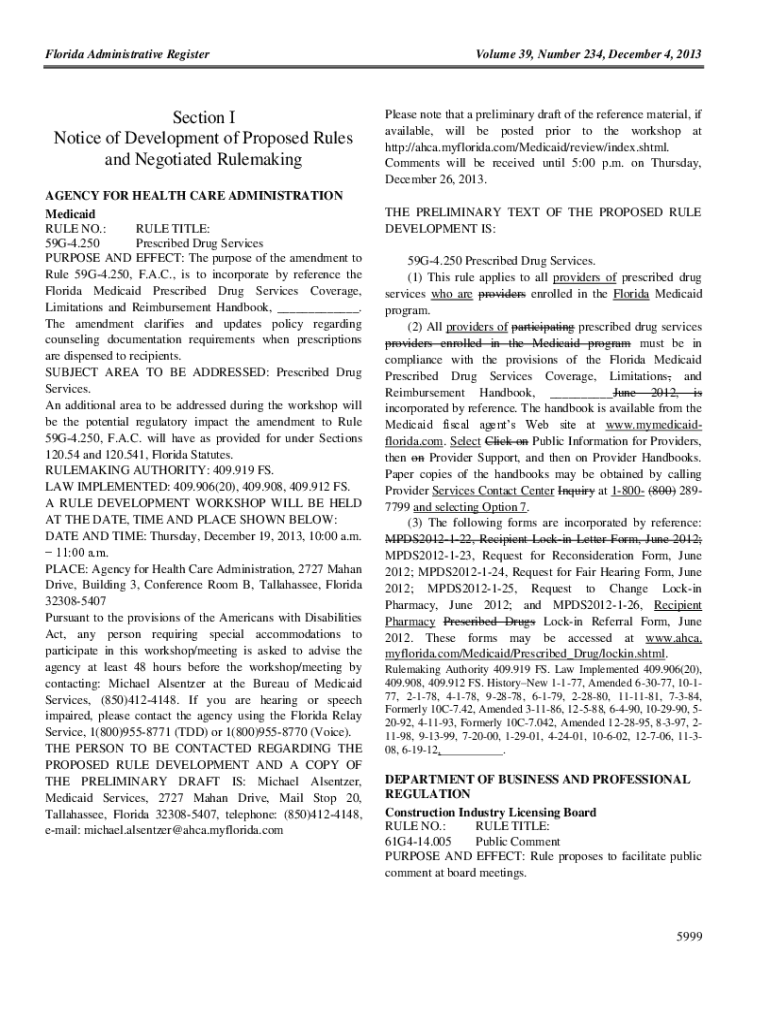Florida Administrative RegisterSection I Notice of Development of Proposed Rules and Negotiated Rule making AGENCY FOR HEALTH CARE ADMINISTRATION Medicaid Rules NO.: RULE TITLE: 59G4.250 Prescribed