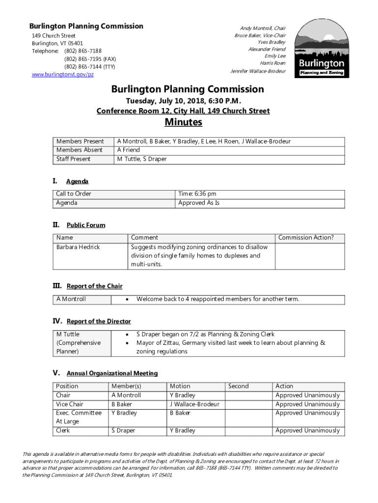 Burlington Planning Commission Andy Mon troll, Chair Bruce Baker, Timeshare Yves Bradley Alexander Friend Emily Lee Harris Roen149 Church Street Burlington, VT 05401 Telephone: (802) 8657188 (802)