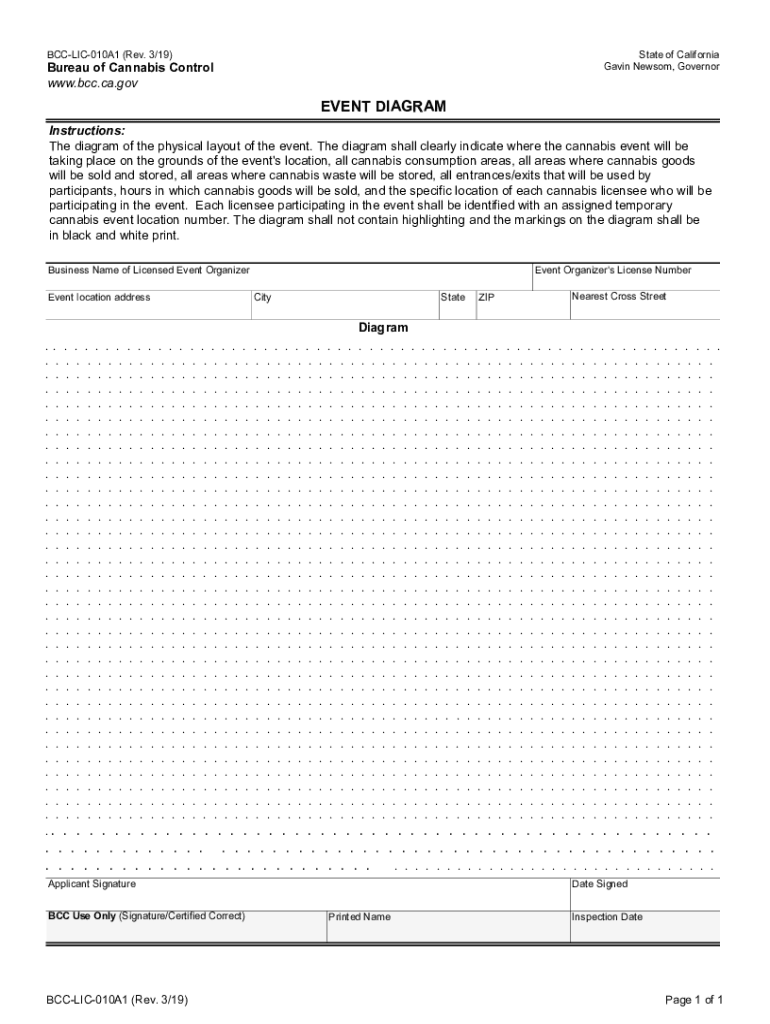 BCCLIC010A1 (Rev. 3/19)State of California Gavin Newsom, GovernorBureau of Cannabis Control www.bcc.ca.govEVENT DIAGRAM Instructions: The diagram of the physical layout of the event. The diagram shall