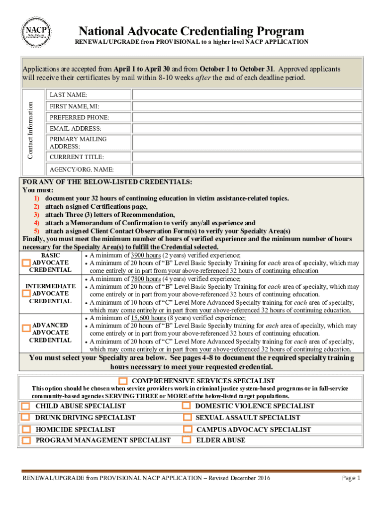 National Advocate Credentialing ProgramRENEWAL/UPGRADE from PROVISIONAL to a higher level NAACP APPLICATIONSUBMISSION INSTRUCTIONS & REQUIREMENTS This application is to be used by applicants who want