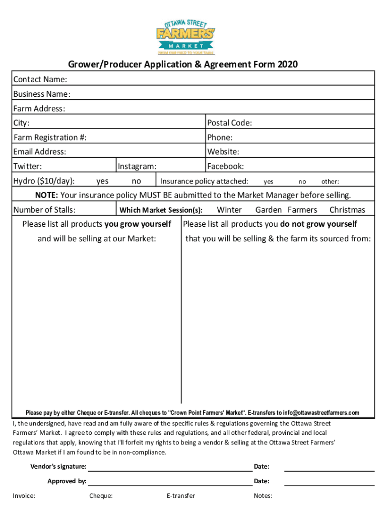 Grower/Producer Application & Agreement Form 2020 Contact Name: Business Name: Farm Address: City:Postal Code:Farm Registration #:Phone:Email Address:Website:Twitter:Instagram:Hydro ($10/day):yesnoFacebook: