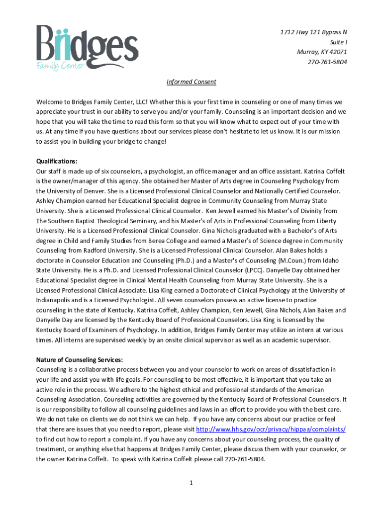 1712 Hwy 121 Bypass N Suite I Murray, KY 42071 2707615804 Informed Consent Welcome to Bridges Family Center, LLC! Whether this is your first time in counseling or one of many times we appreciate your