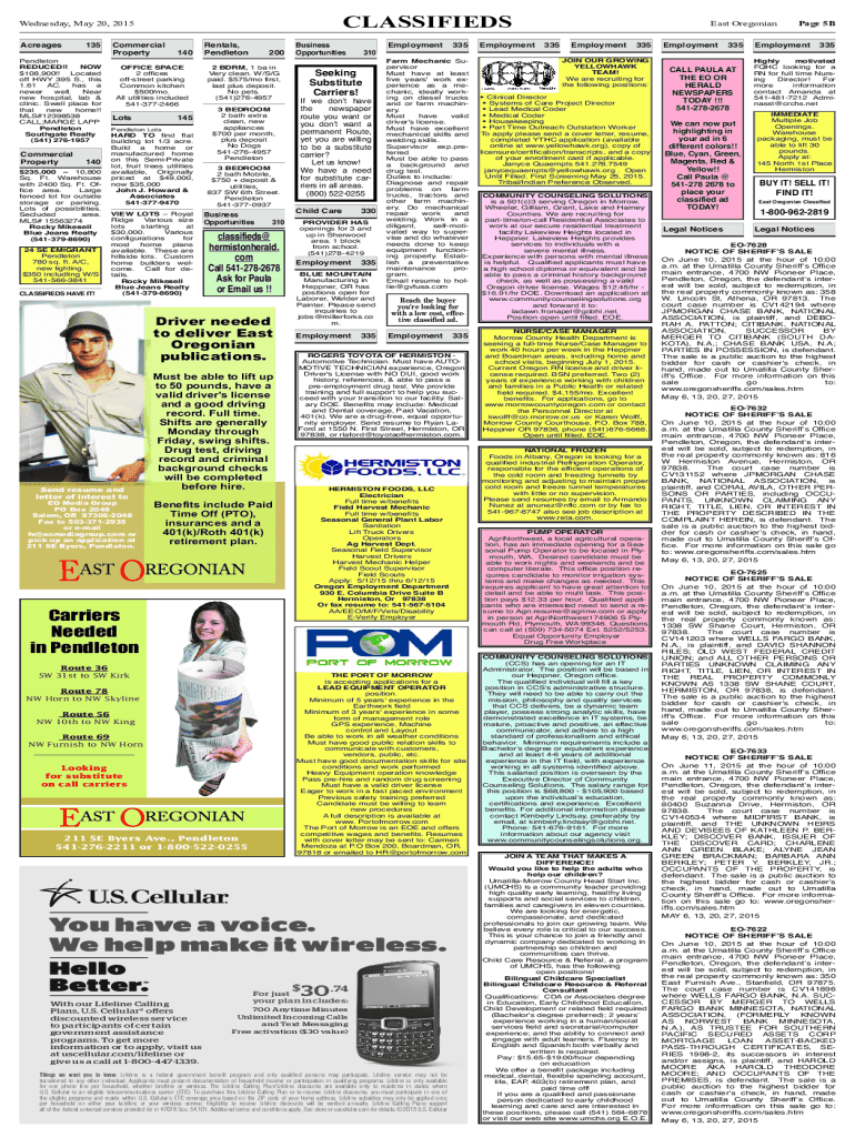 CLASSIFIEDS Wednesday, May 20, 2015 Acreages135Pendleton REDUCED!! NOW $108,900!! Located off HWY 395 S., this 1.61 AC. has a newer well. Near new hospital, lab & clinic. Swell place for that new