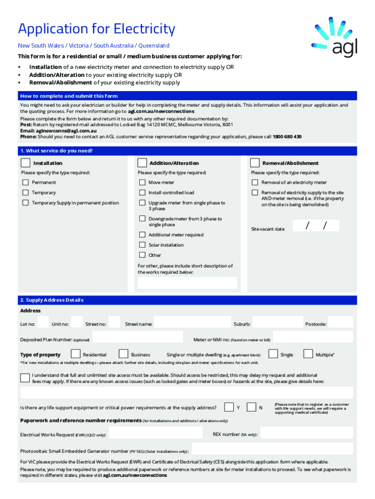 Application for Electricity New South Wales / Victoria / South Australia / Queensland This form is for a residential or small / medium business customer applying for: Installation of a new electricity