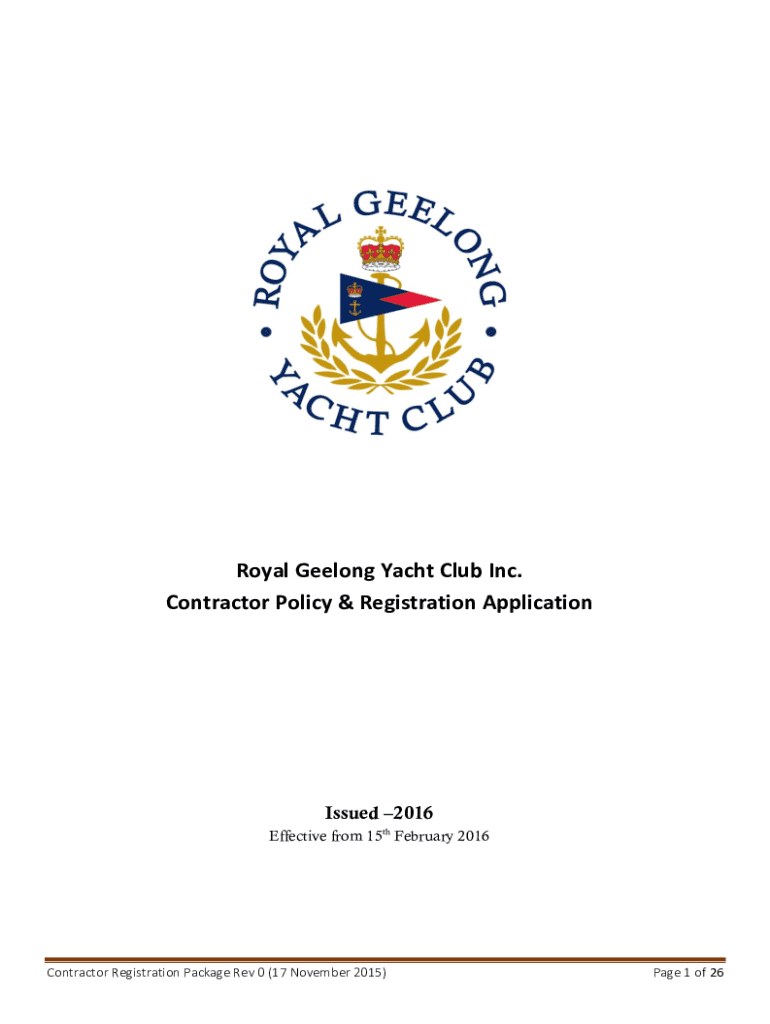 Royal Geelong Yacht Club Inc. Contractor Policy & Registration ApplicationIssued 2016 Effective from 15th February 2016Contractor Registration Package Rev 0 (17 November 2015)Page 1 of 26GUIDE TO