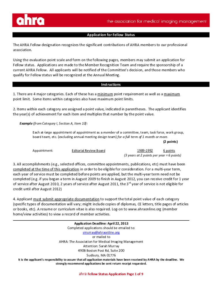 ApplicationforFellowStatus TheAHRAFellowdesignationrecognizesthesignificantcontributionsofAHRAmemberstoourprofessional association. Usingtheevaluationpointscaleandformonthefollowingpages, membersmaysubmitanapplicationfor
