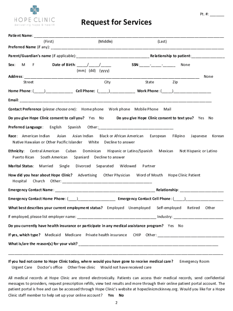 Pt. #: ___Request for ServicesPatient Name: ___(First)(Middle)(Last)Preferred Name (if any): ___Parent/Guardians name (if applicable):___ Relationship to patient:___Sex:Date of Birth: ___/___/___SSN:_________None(mm)(dd)(YYY)Address: