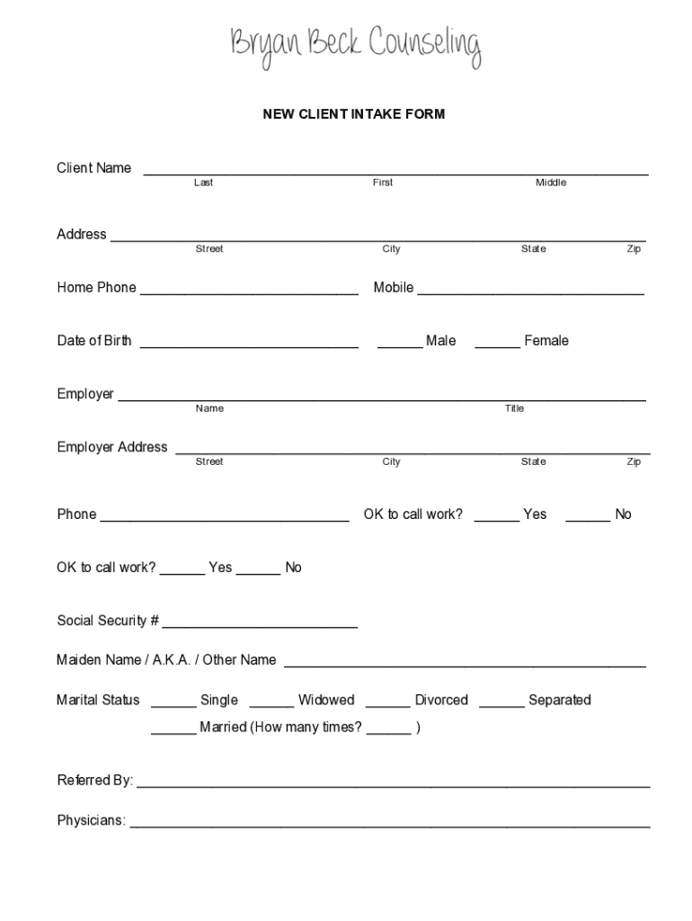 NEW CLIENT INTAKE Formulaic Name ___ LastFirstMiddleAddress ___ StreetCityStateZipHome Phone ___Mobile ___Date of Birth ______ Male___ FemaleEmployer ___ NameTitleEmployer Address ___ Freephone ___CityStateOK