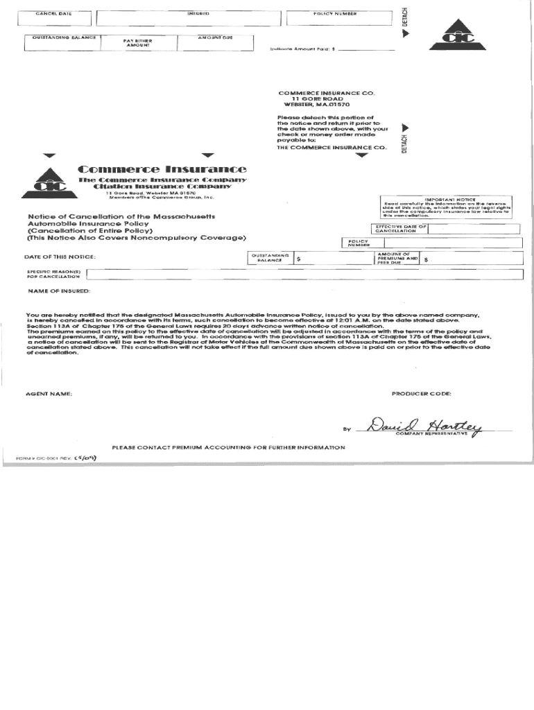 (Name and Address of Insurance Company)211 Main Street Webster, Massachusetts 01570Date of this Notice: (NAME AND ADDRESS OF INSURED)NOTICE OF CANCELLATION OF THE MASSACHUSETTS AUTOMOBILE INSURANCE