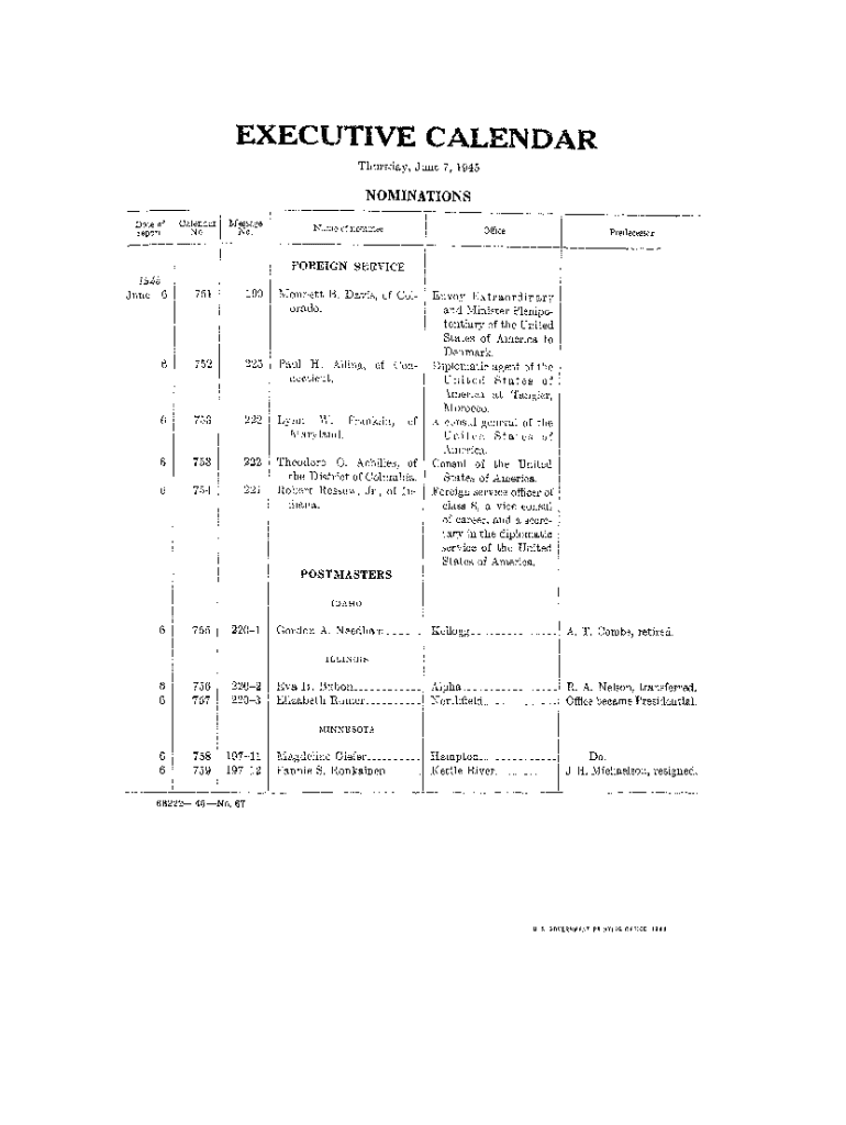 EXECUTIVE CALENDAR Thursday, June 7, 1945NOMINATIONS Date of 1eportOalndarNoMessage No. Name ofnommeeOt!lcePredecessor1 FOREIGN SERVICE 1945 June 6751199Monnett B. Davis, of Colorado.6752225Paul H.