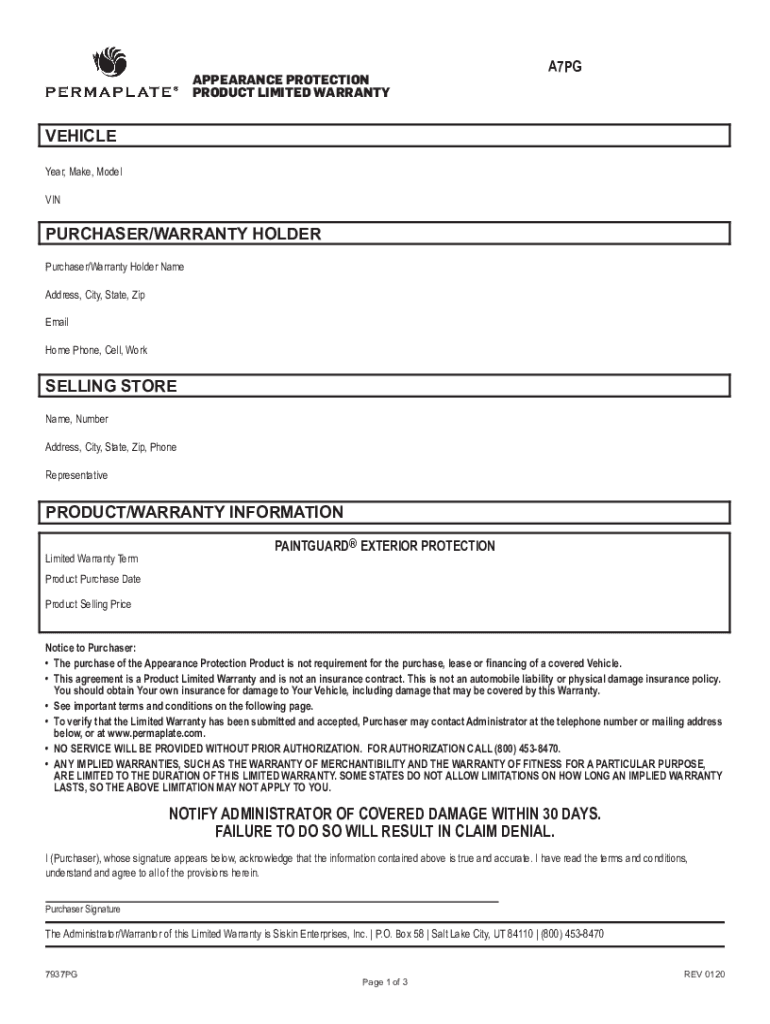 APPEARANCE PROTECTION PRODUCT LIMITED WARRANTYA7PGVEHICLE Year, Make, Model PURCHASER/WARRANTY HOLDER Purchaser/Warranty Holder Name Address, City, State, Zip Email Home Phone, Cell, Worsening STORE
