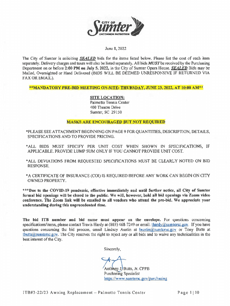 CITY OF SUMTER BID FORM City of Sumter, South Carolina, a Body Politic and Corporate and Political Subdivision of the State of SC FORMAL INVITATIONTOBID: ITB #322/23 NAME OF BID: Awning Replacement