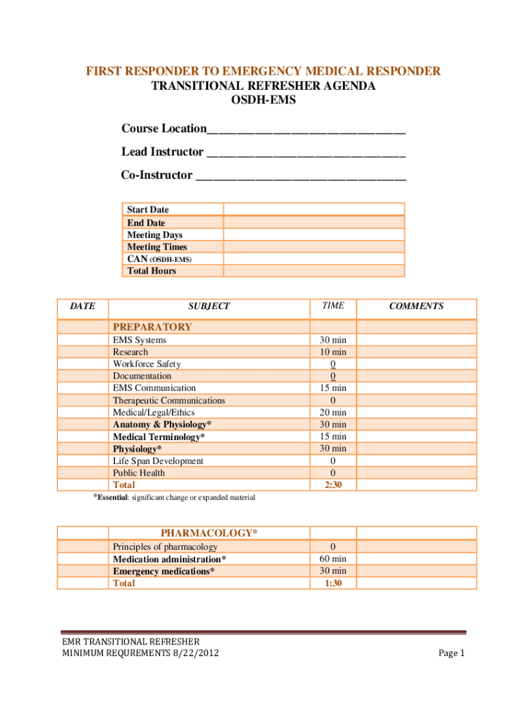 FIRST RESPONDER TO EMERGENCY MEDICAL RESPONDER TRANSITIONAL REFRESHER AGENDA OTHERS Course Location___ Lead Instructor ___ Constructor ___ Start Date End Date Meeting Days Meeting Times CAN (OTHERS)