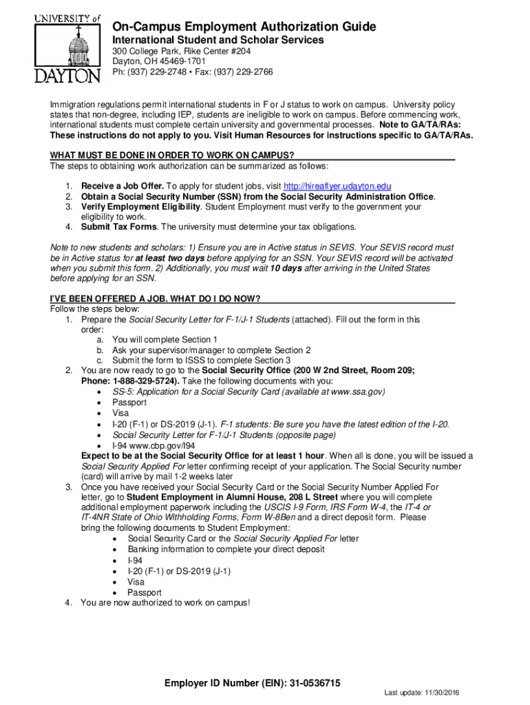 Campus Employment Authorization Guide International Student and Scholar Services 300 College Park, Like Center #204 Dayton, OH 454691701 pH: (937) 2292748 Fax: (937) 2292766Immigration regulations