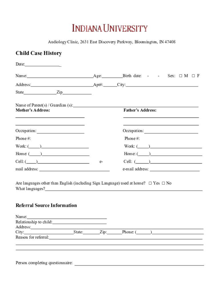 Audiology Clinic, 2631 East Discovery Parkway, Bloomington, IN 47408Child Case History Date:_Name:Age:Address:Apt#:Stillbirth date:City:Misname of Parent(s) / Guardian (s): Mothers Address:Fathers