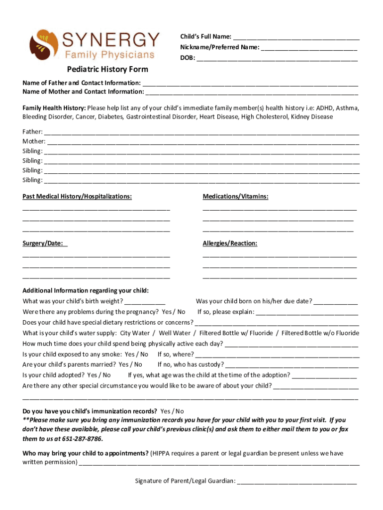 Get the free Nickname/Preferred Name: DOB: Pediatric History Form