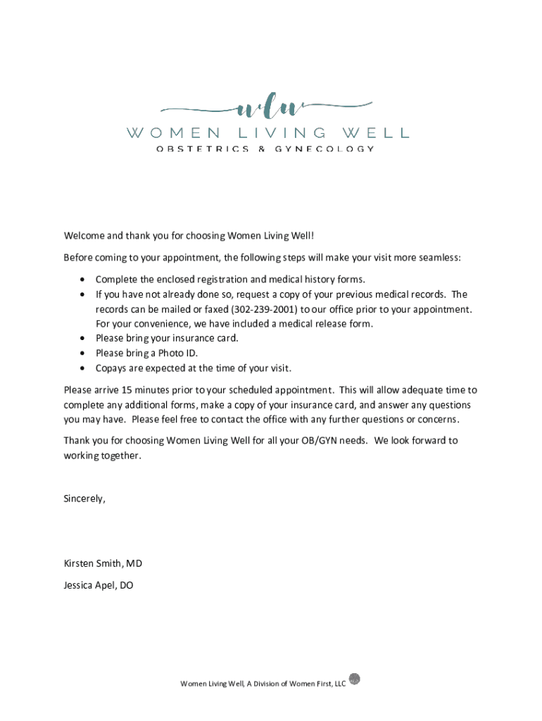 Welcome and thank you for choosing Women Living Well! Before coming to your appointment, the following steps will make your visit more seamless: Complete the enclosed registration and medical history