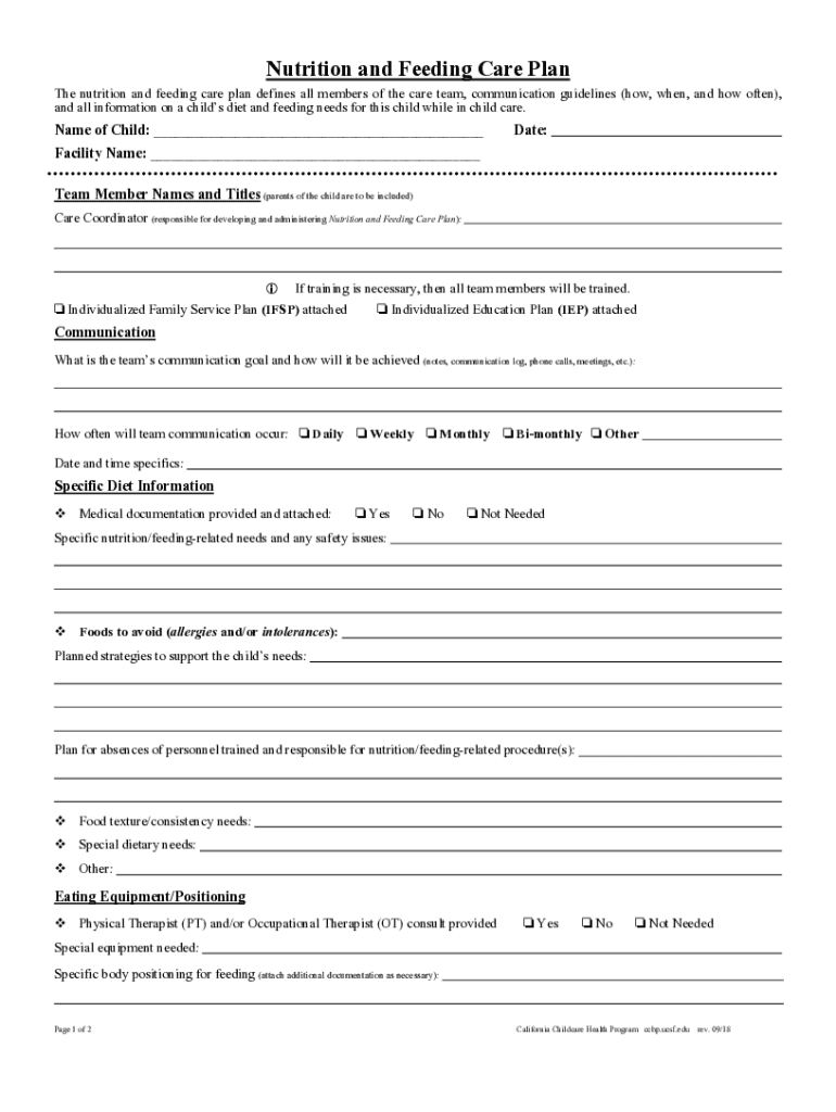 Nutrition and Feeding Care Plan The nutrition and feeding care plan defines all members of the care team, communication guidelines (how, when, and how often), and all information on a children diet