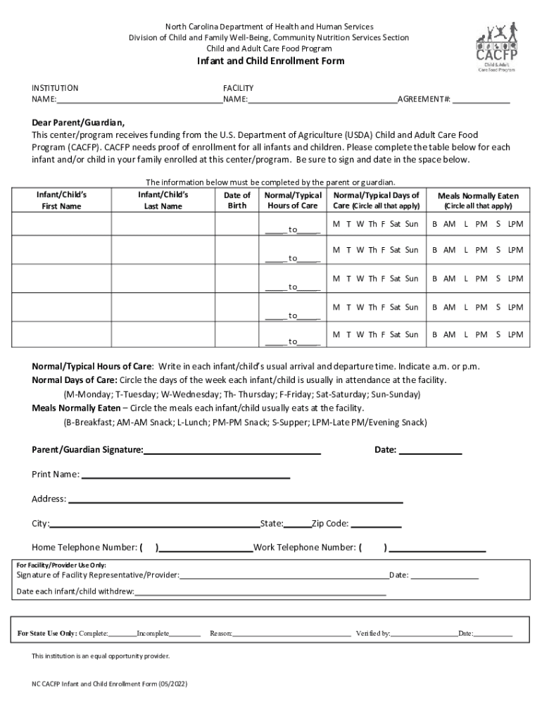 North Carolina Department of Health and Human Services Division of Child and Family WellBeing, Community Nutrition Services Section Child and Adult Care Food ProgramInfant and Child Enrollment Reinstitution