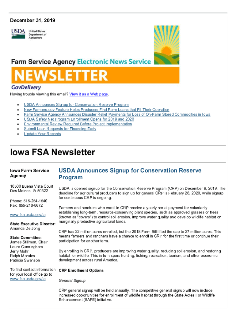 December 31, 2019Having trouble viewing this email? View it as a Web page. USDA Announces Sign up for Conservation Reserve Program New Farmers.gov Feature Helps Producers Find Farm Loans that Fit
