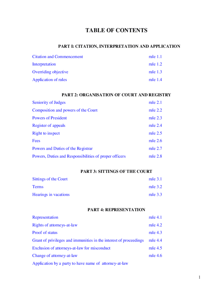 TABLE OF CONTENTS PART I: CITATION, INTERPRETATION AND APPLICATION Citation and Commencement rule 1.1Interpretationrule 1.2Overriding objective rule 1.3Application of rules rule 1.4PART 2: Organization