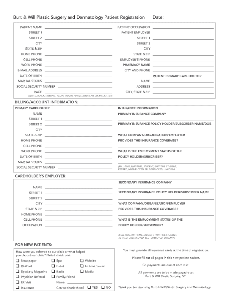 Burt & Will Plastic Surgery and Dermatology Patient Registration|PATIENT IMPATIENT OCCUPATIONSTREET 1PATIENT EMPLOYERSTREET 2STREET 1CITYSTREET 2STATE & ZIPCITYHOME PROSTATE & CELL PHONEEMPLOYERS