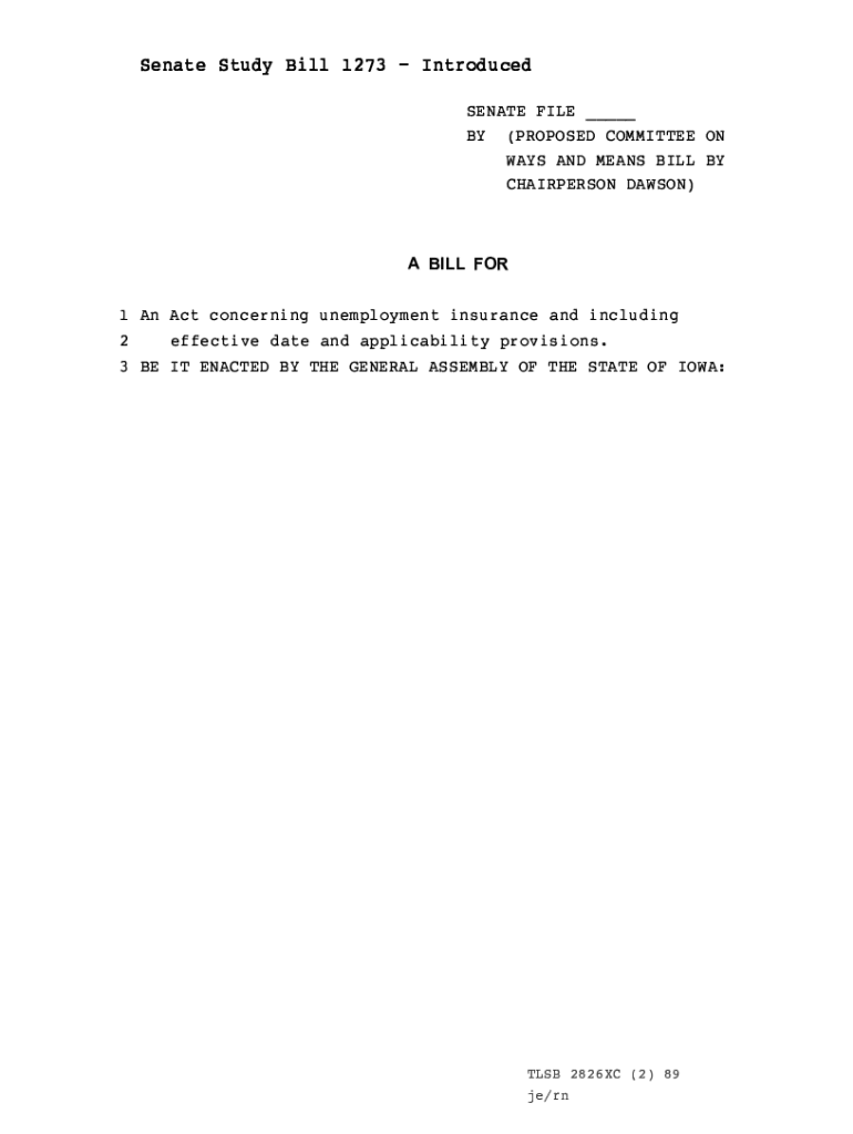 Senate Study Bill 1273 Introduced SENATE FILE ___ BY (PROPOSED COMMITTEE ON WAYS AND MEANS BILL BY CHAIRPERSON DAWSON)A BILL FOR1 An Act concerning unemployment insurance and including 2 effective