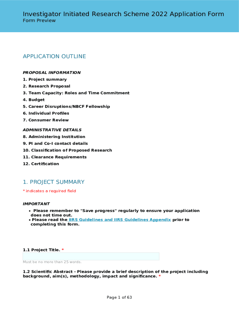 Investigator Initiated Research Scheme 2022 Application Form PreviewAPPLICATION OUTLINE PROPOSAL INFORMATION 1. Project summary 2. Research Proposal 3. Team Capacity: Roles and Time Commitment 4.