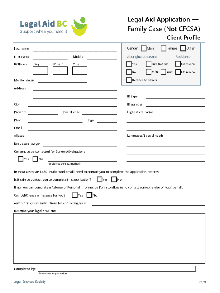 Legal Aid Application Family Case (Not CF CSA)Client ProfileGenderLast name First name BirthdateMonthFemaleAboriginal Ancestry:Middle DayMaleYearMarital statusOtherResidenceYesFirst Nations reserveNoMtisOff