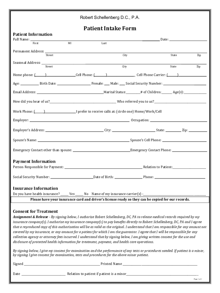 Robert Schoenberg D.C., P.A. Patient Intake Form Patient Information Full Name:FirstMIPermanent Address:___ Date:LastStreetSeasonal Address: ___ StreetCityStateCityStateZip___ iPhone phone: (___)___Cell