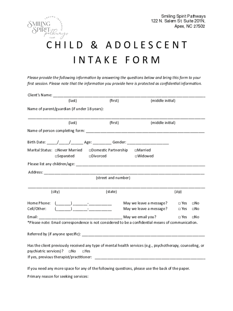 Smiling Spirit Pathways 122 N. Salem St. Suite 201 N, Apex, NC 27502CHILD & ADOLESCENT I N TA K E F O R M Please provide the following informa4on by answering the ques4ons below and bring this form