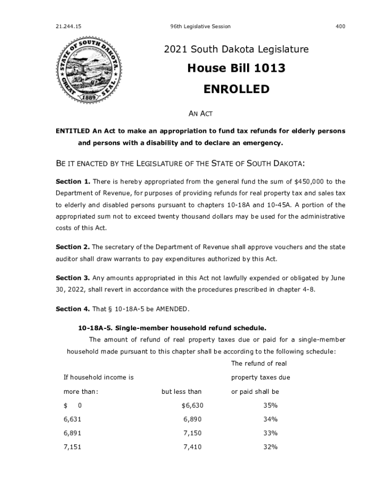 21.244.1596th Legislative Session4002021 South Dakota Legislature House Bill 1013 ENROLLED AN ACT ENTITLED An Act to make an appropriation to fund tax refunds for elderly persons and persons with