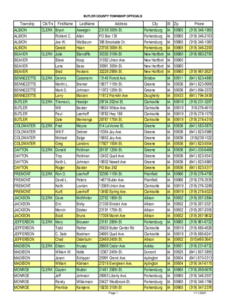 BUTLER COUNTY TOWNSHIP OFFICIALSTownshipClk/TrsFirstNameLastNameAddressCitySt ZipPhoneALBION ALBION ALBIONCLERK Bryon Richard C. Joe W. GeraldAswegen Allan Album Haan23159 300th St. PO Box 130 306