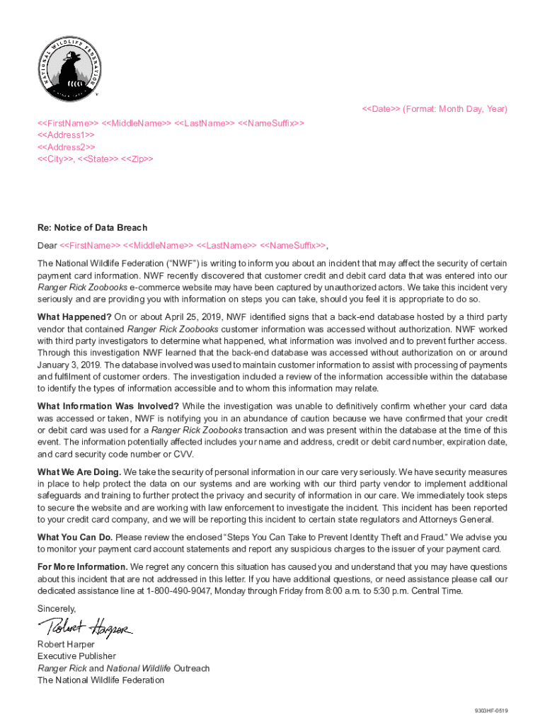 Date (Format: Month Day, Year) Filename Middleware Hostname NameSuffix Address1 Address2 City, State Zip Re: Notice of Data Breach Dear Filename Middleware Hostname NameSuffix, The National Wildlife