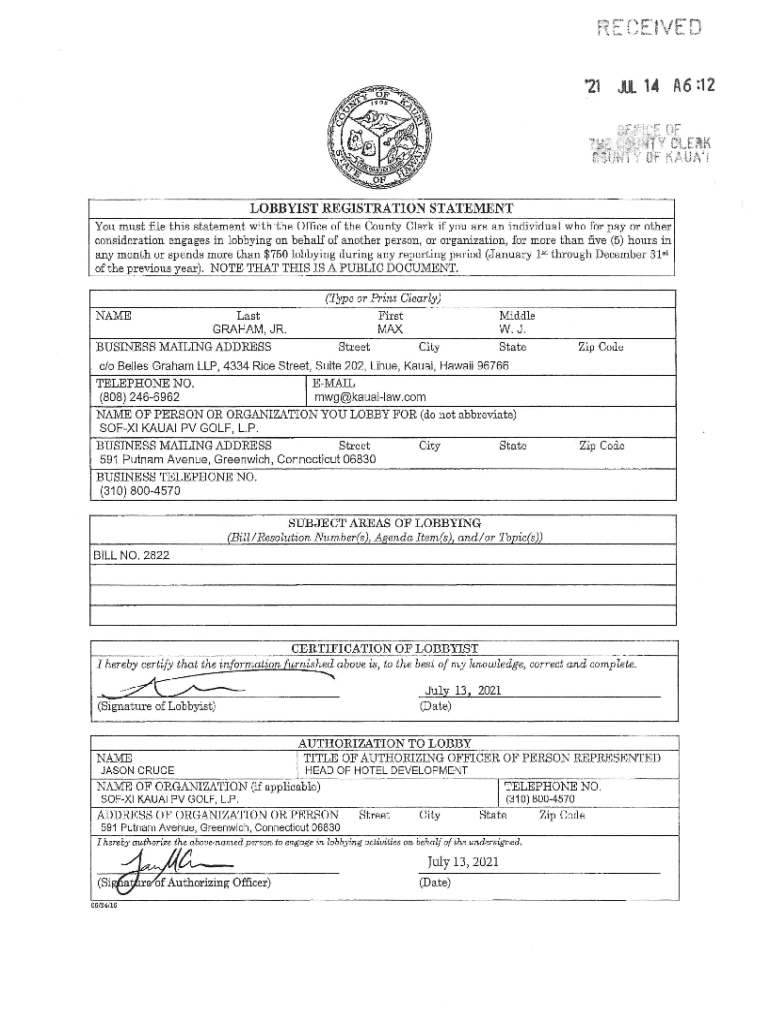 Ref\'EVEN \'21J.l 1 A6 :12LOBBYIST REGISTRATION STATEMENT You must file this statement with the Office of the County Clerk if you are an individual who for pay or other consideration engages in lobbying