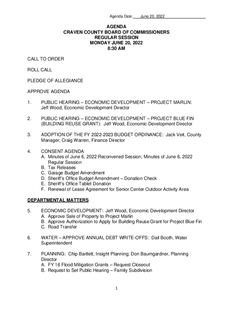 Agenda Date:June 20, 2022AGENDA CRAVEN COUNTY BOARD OF COMMISSIONERS REGULAR SESSION MONDAY, JUNE 20, 2022 8:30 AM CALL TO ORDER ROLL CALL PLEDGE OF ALLEGIANCE APPROVE AGENDA 1.PUBLIC HEARING ECONOMIC