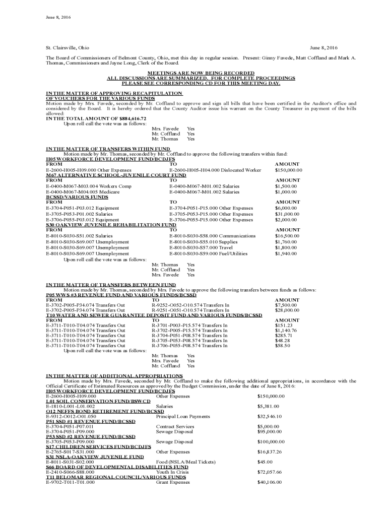 June 8, 2016St. Clarksville, Ohio June 8, 2016The Board of Commissioners of Belmont County, Ohio, met this day in regular session. Present: Ginny Faced, Matt Copeland and Mark A.