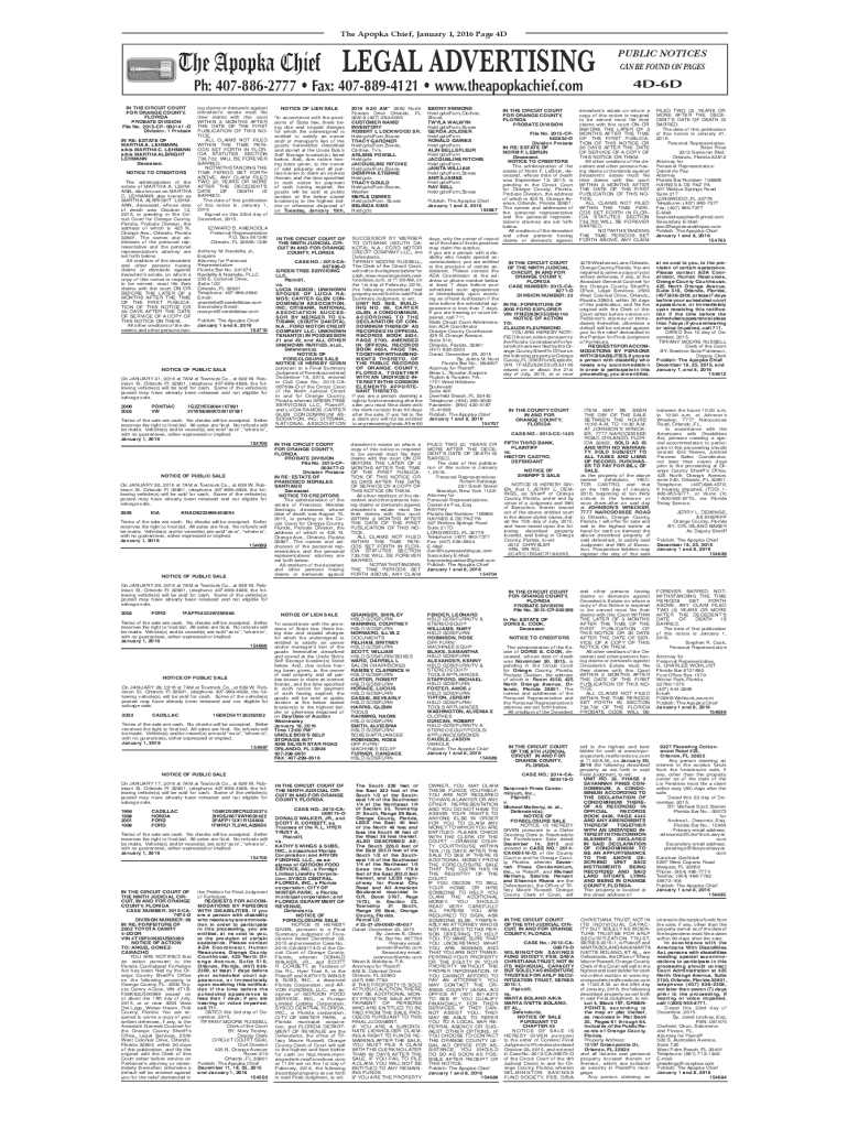 The Apopka Chief, January 1, 2016, Page 4DThe Apopka Chief LEGAL ADVERTISING pH: 4078862777 Fax: 4078894121 www.theapopkachief.comIN THE CIRCUIT COURT FOR ORANGE COUNTY, FLORIDA PROBATE DIVISION File