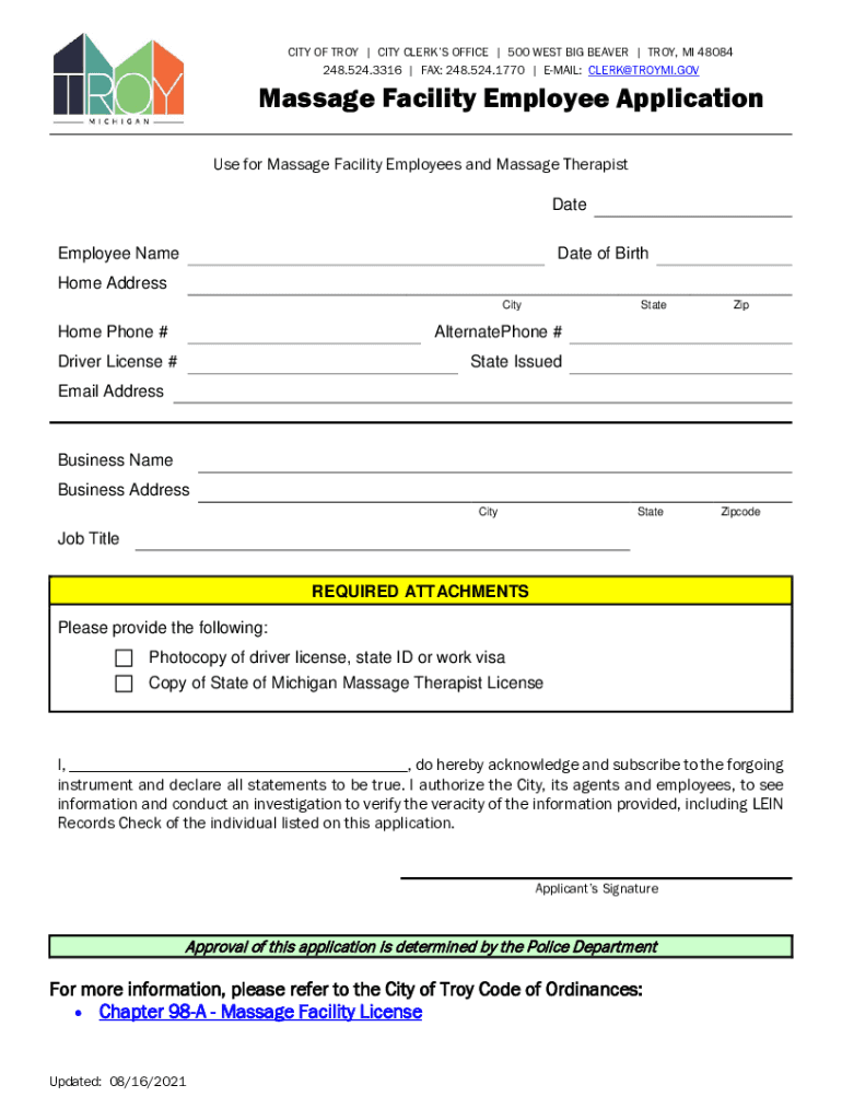 248.524.3316 | FAX: 248.524.1770 | EMAIL: CLERK@TROYMI.GOVMassage Facility Employee Application