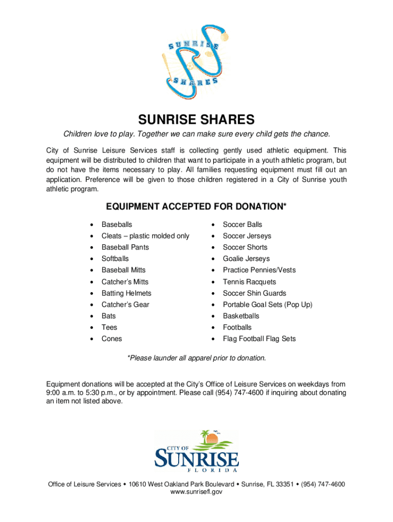 SUNRISE SHARES Children love to play. Together we can make sure every child gets the chance. City of Sunrise Leisure Services staff is collecting gently used athletic equipment. This equipment will