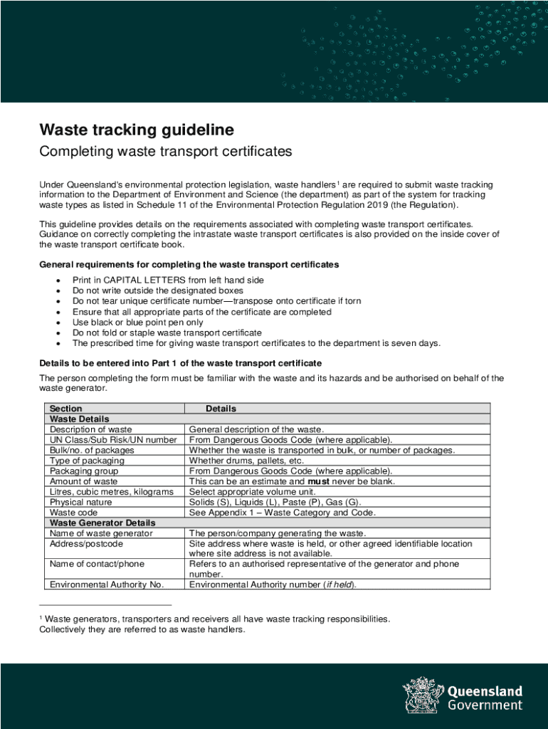 Waste tracking guideline Completing waste transport certificates Under Queensland\'s environmental protection legislation, waste handlers 1 are required to submit waste tracking information to the