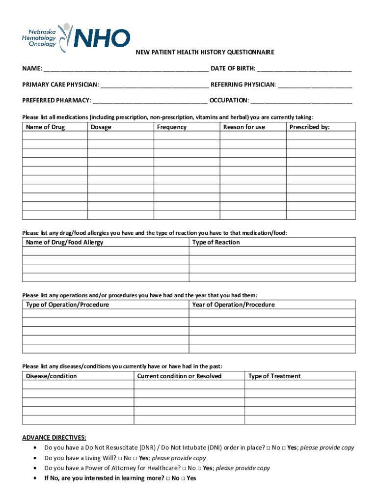 NEW PATIENT HEALTH HISTORY QUESTIONNAIRE NAME: ___ DATE OF BIRTH: ___ PRIMARY CARE PHYSICIAN: ___ REFERRING PHYSICIAN: ___ PREFERRED PHARMACY: ___ OCCUPATION: ___ Please list all medications (including
