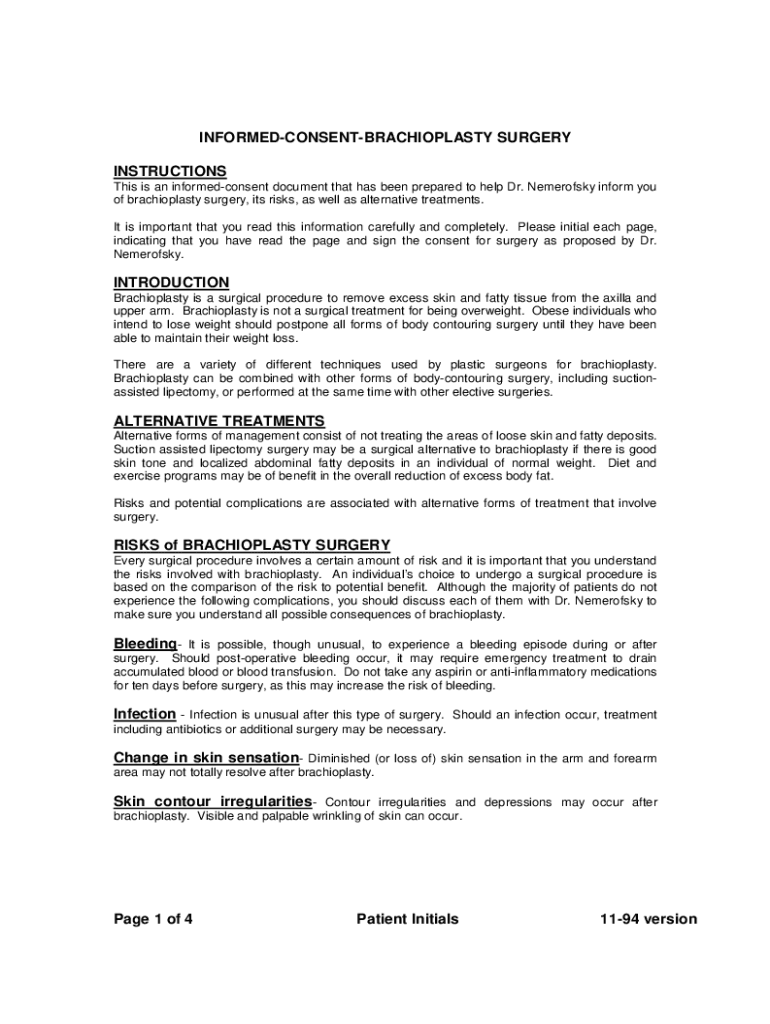 Read the entire form carefully to understand the potential risks, benefits, and alternatives of the brachioplasty procedure.