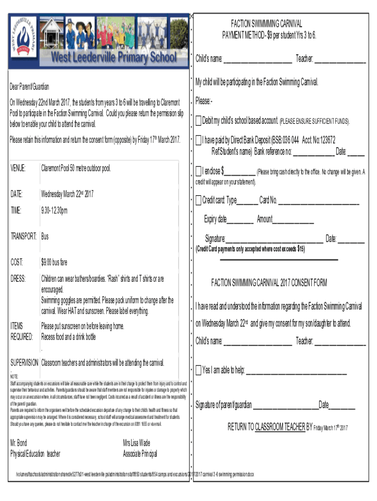 \” FACTION SWIMMING CARNIVAL. PAYMENT METHOD $9 per student Yrs 3 to 6. . . . Child's name: ___ Teacher: ___. My child will be participating in the Faction Swimming Carnival. Dear Parent/Guardian.