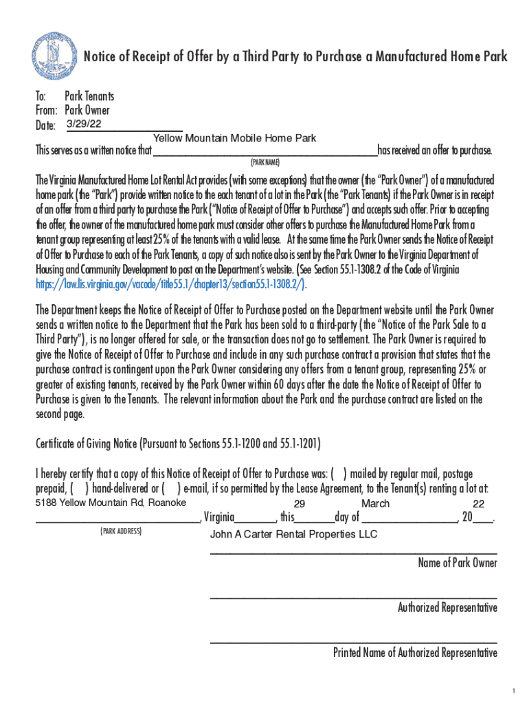 Notice of Receipt of Offer by a Third Party to Purchase a Manufactured Home Park To: From: Date:Park Tenants Park Owner 3/29/22 ___ Yellow Mountain Mobile Home Parthia serves as a written notice that