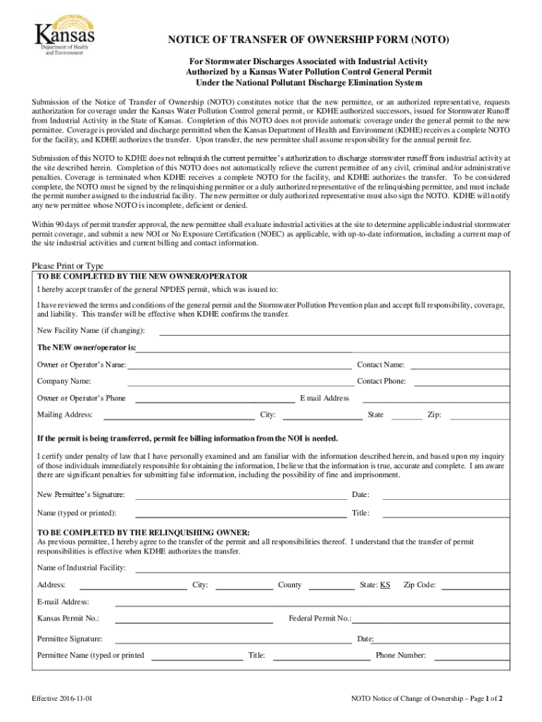NOTICE OF TRANSFER OF OWNERSHIP FORM (NOT) For Stormwater Discharges Associated with Industrial Activity Authorized by a Kansas Water Pollution Control General Permit Under the National Pollutant