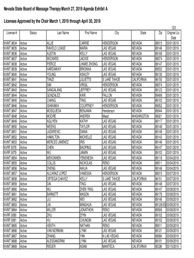 Get the free Nevada State Board of Massage Therapy AGenda Exhibit A March ... - massagetherapy nv