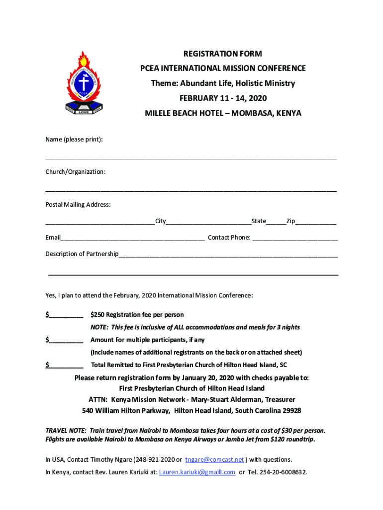 REGISTRATION FORM PLEA INTERNATIONAL MISSION CONFERENCE Theme: Abundant Life, Holistic Ministry FEBRUARY 11 14, 2020 MILE LE BEACH HOTEL MOMBASA, KENYA Name (please print): ___ Church/Organization: