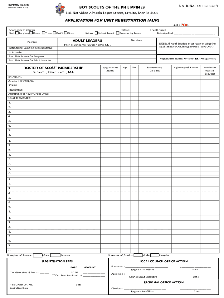 BSP FORM No. 601NATIONAL OFFICE COWBOY SCOUTS OF THE PHILIPPINES(Revised 30 Jan 2020)181 Nativized AlmedaLopez Street, Ermina, Manila 1000