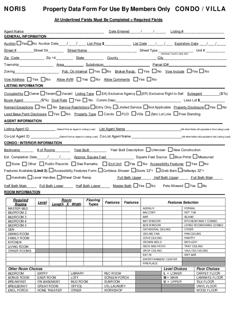 NORISProperty Data Form For Use By Members Only CONDO / VILLA All Underlined Fields Must Be Completed Required Fieldsmen Name___ GENERAL INFORMATION AuctionDate Entered___/___/___Listing #___No Auction